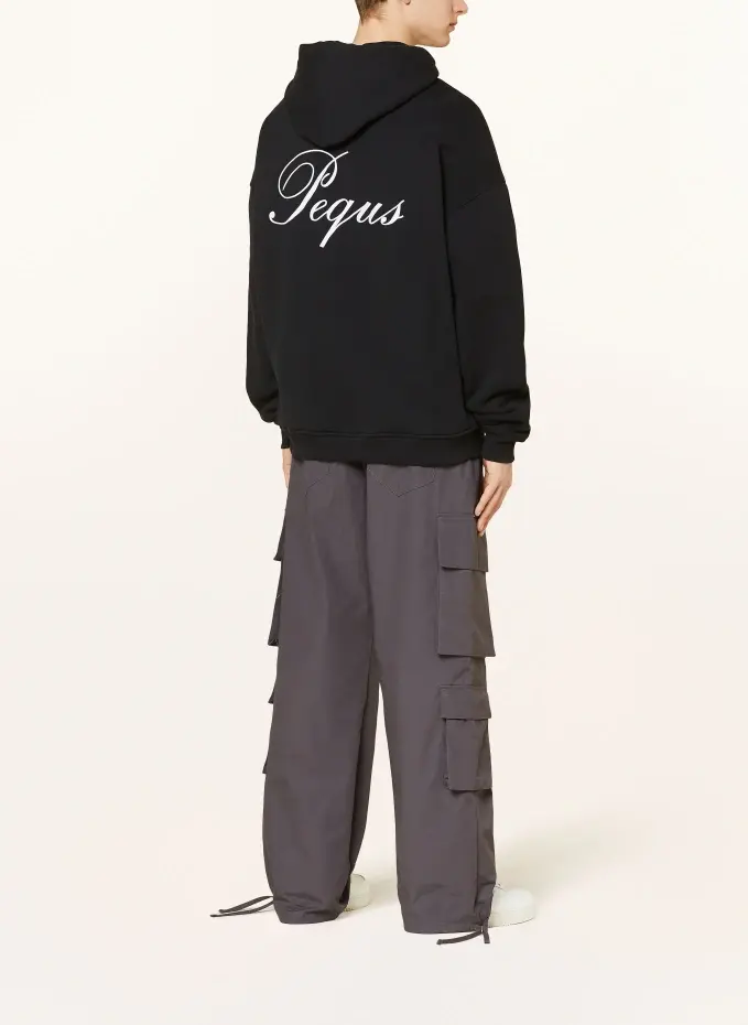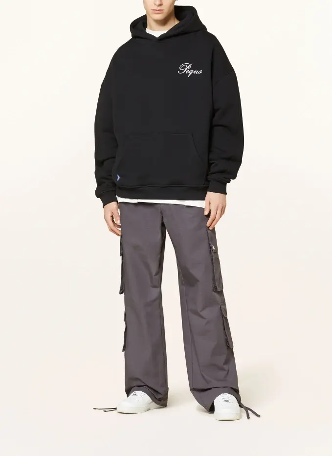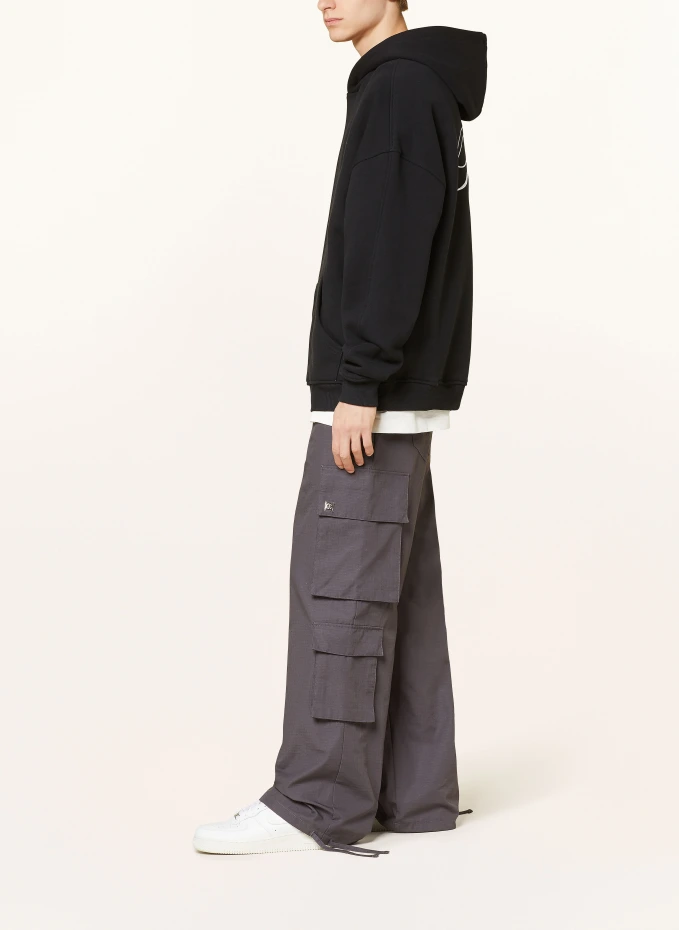 Обычная высота талии. Коническая ножка. Эластичный пояс со шнурком. Боковые грузовые карманы. Шнурок на штанинах заканчивается. Деталь этикетки на грузовом кармане. Легкое ощущение