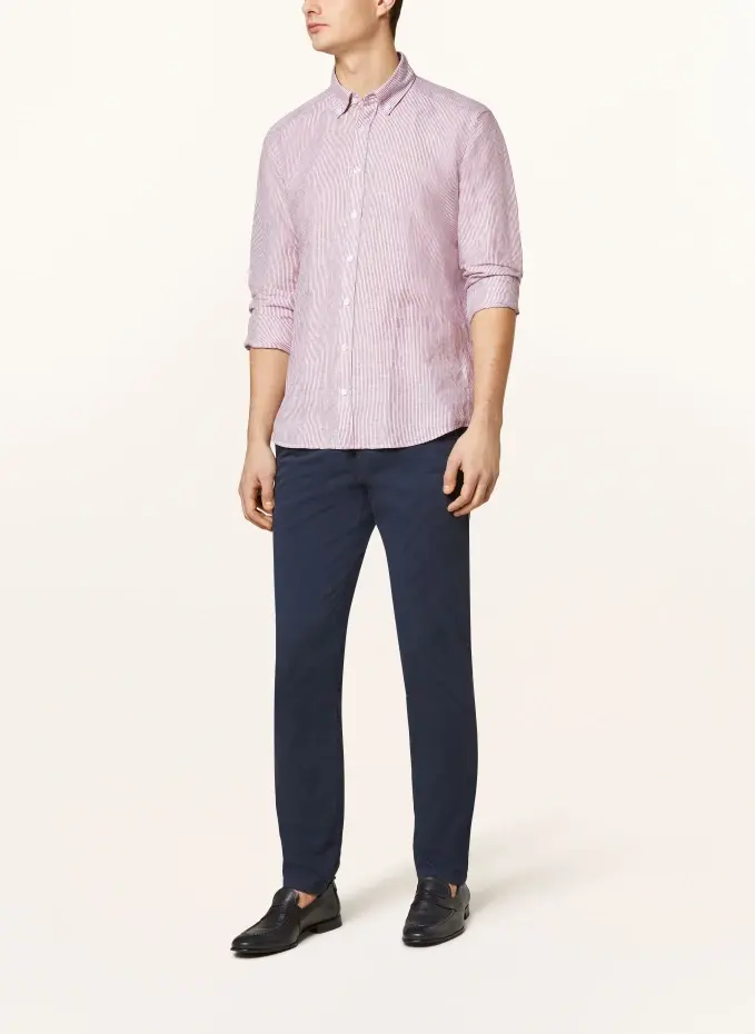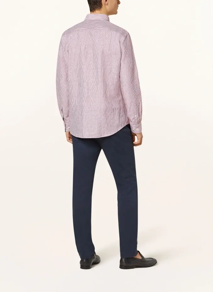Посадка: обычная посадка. Две складки на спине. Воротник на пуговицах. Широкая кокетка сзади. Прикрепленная планка с пуговицами. Регулируемая по ширине манжета на одной пуговице. Полосатый узор по всей поверхности. Легкая смесь льна