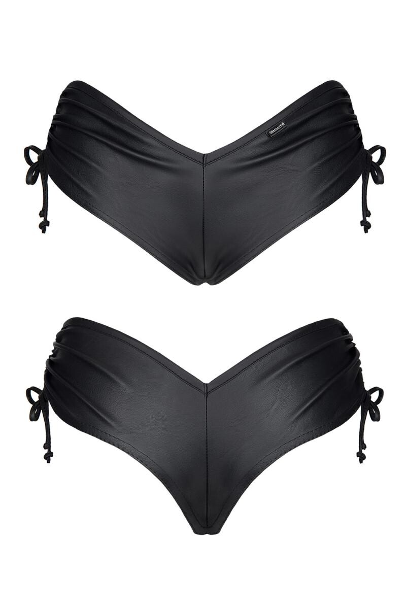 Шорты из черной эластичной искусственной кожи. Треугольный профиль спереди. Завязки по бокам.