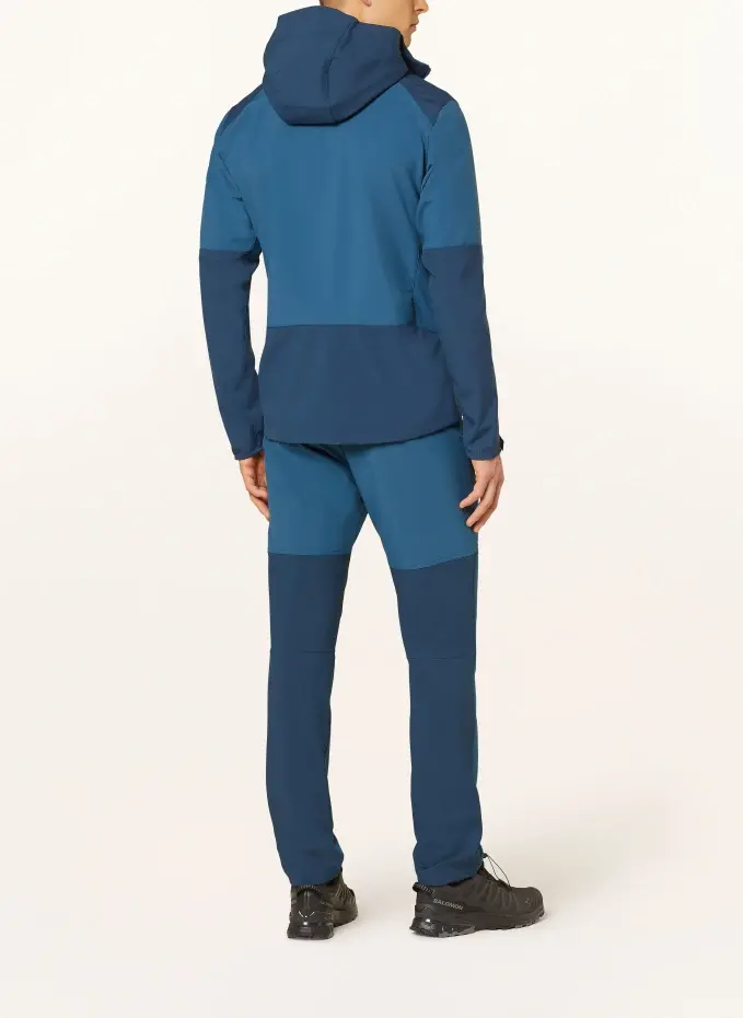 Изготовлен из софтшелла Windproof 100. Прямого покроя. Эластичный материал. Ветрозащитный, дышащий. Водоотталкивающее эко покрытие. PFC бесплатно. Прикрепленный капюшон с козырьком и эластичной кромкой. Регулируемый по высоте капюшон. Высокий воротник. Застегивается на двустороннюю молнию с подкладкой. Шарнирные рукава. Длинные вентиляционные молнии без сетки. Регулируемые по ширине манжеты с застежкой-липучкой. Боковые карманы на молнии с сетчатой подкладкой. Ширина низа с кулиской. Сетчатая подкладка спереди, вафельный материал сзади. Детали этикетки. По заявлению производителя, подходит для пеших прогулок, треккинга и путешествий.