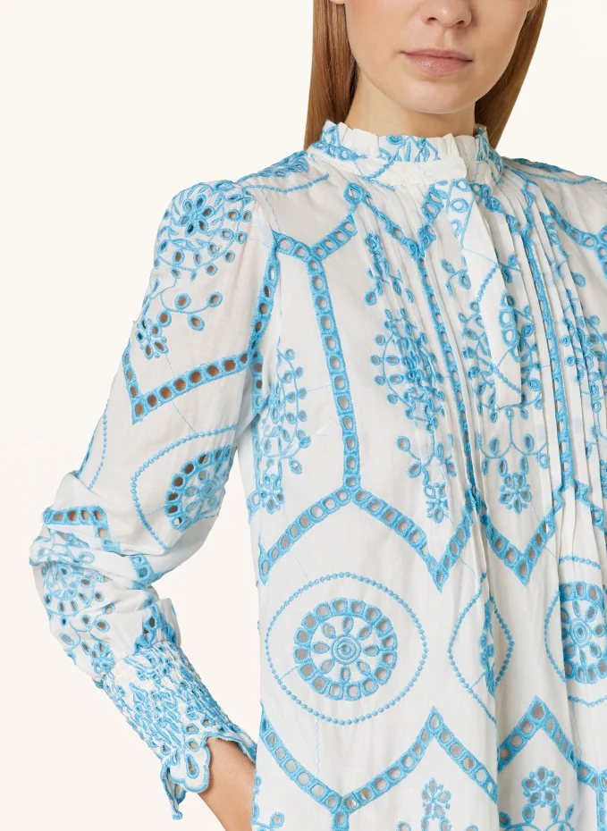 Прямого покроя. Широкая кокетка сзади. Воротник с рюшами. Складка на спине. Закрывается на короткую планку с потайными пуговицами. Длинный рукав. Присборенные эластичные рукава на концах. Частичная обработка с подкладкой. Защипы спереди. Вышивка с отверстиями по всей поверхности. Изготовлен из хлопка