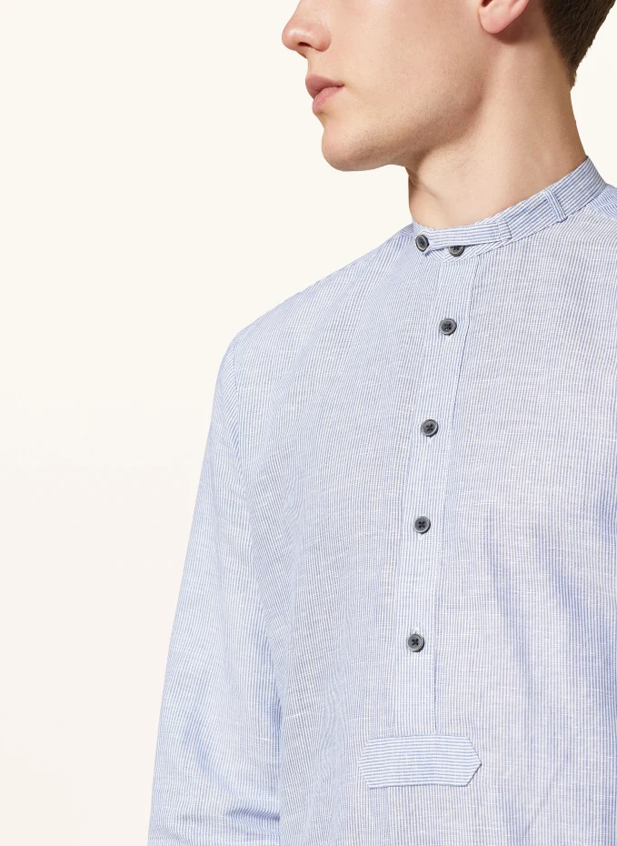 Посадка: обычная посадка. Воротник-стойка. Узкая кокетка сзади. Прикрепленная планка с пуговицами. Регулируемая по ширине манжета на одной пуговице. Полосатый узор. Легкое ощущение. Смесь льна и хлопка