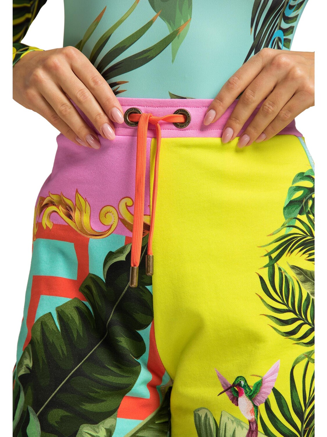Эти шорты впечатляют ярким тропическим принтом, контрастными манжетами и боковым разрезом. Он идеально подходит для занятий спортом и досуга. Для создания завершенного образа его можно легко комбинировать с подходящим боди, топом-борцовкой или блузоном.