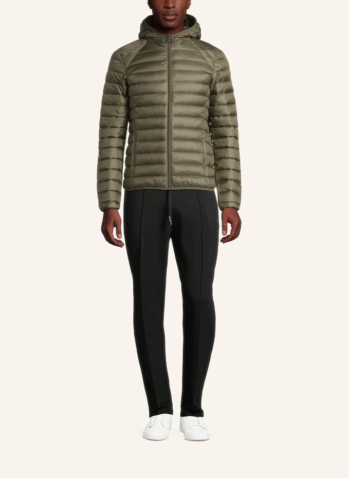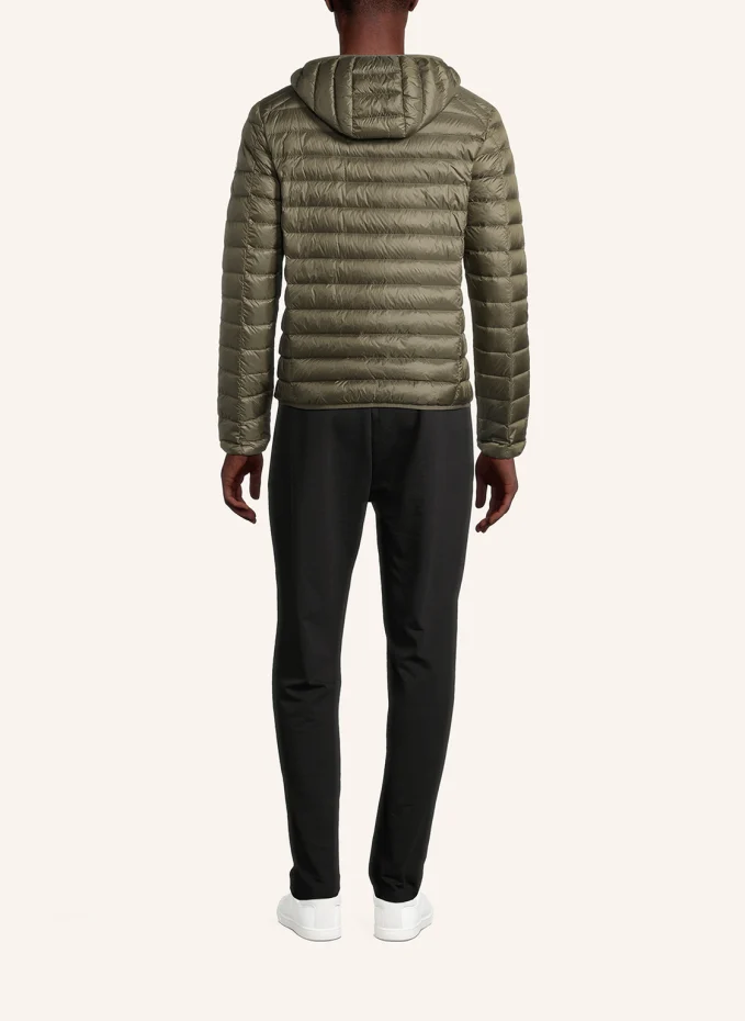 Атласный, стеганый и водоотталкивающий материал. Пухово-перьевой наполнитель с сертификатом «RDS». Плотный разрез. С толстовкой. Боковые карманы. Контрастные по цвету внутренние швы. Оригинальный фетровый логотип на левом рукаве.