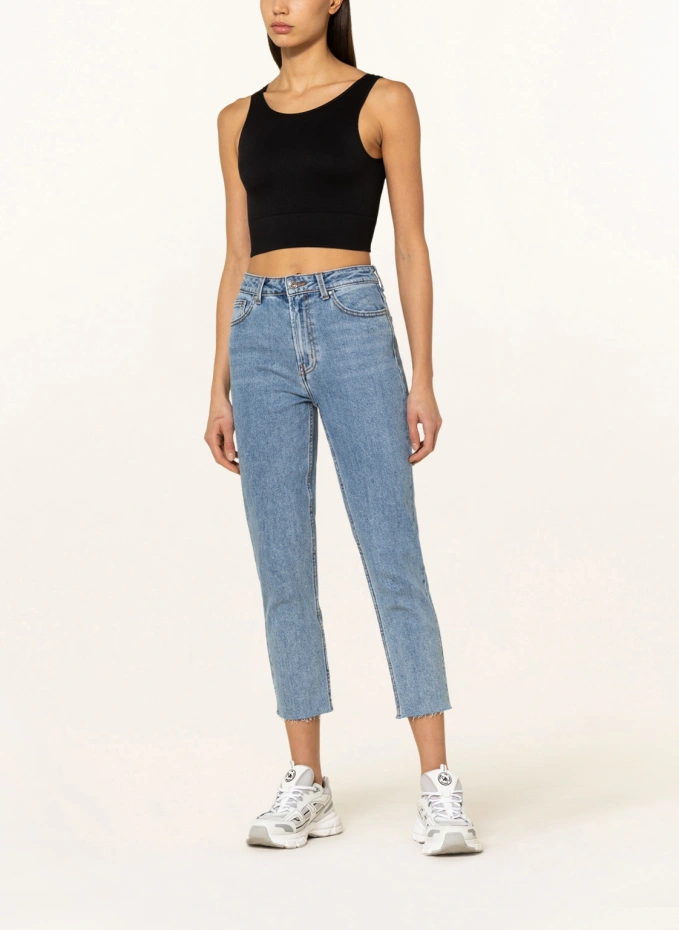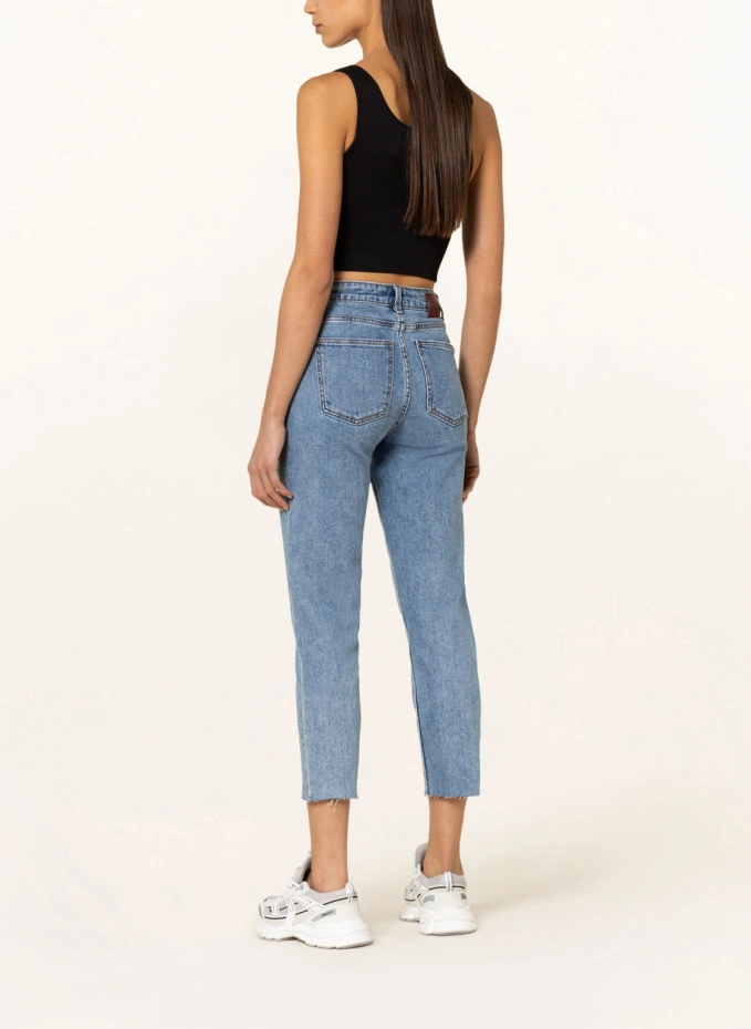 Посадка по данным производителя: Straight Fit. Высокая талия. Зауженная, укороченная ножка. Застежка-молния. 5-карманный стиль. Кожаный значок на поясе. Тонкие оптические складки сиденья. Потертые манжеты на ногах. Разрушенные эффекты на карманах