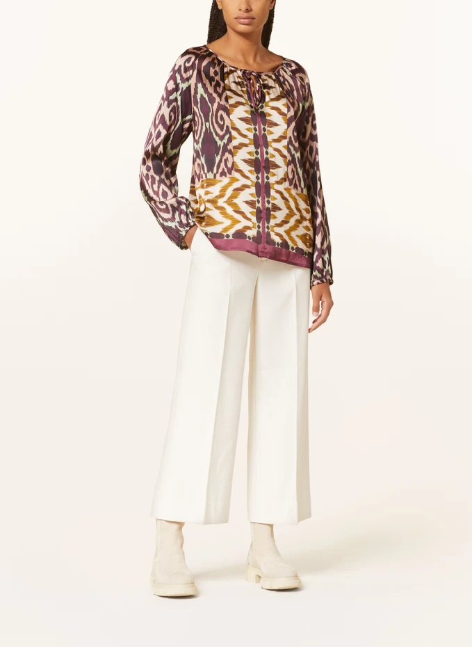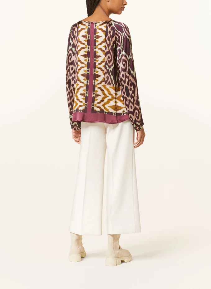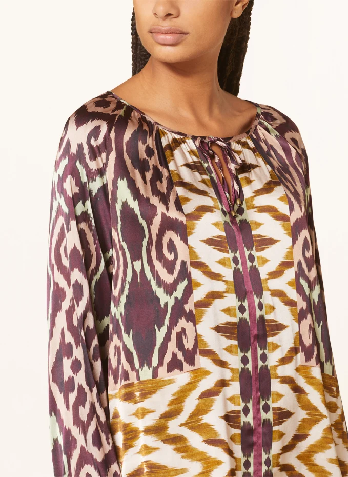 Прямого покроя. Вырез туники с завязками. Длинные рукава реглан. Эластичные кончики рукавов. Этнический узор повсюду. Гладкое ощущение. Качество блестящего сатина