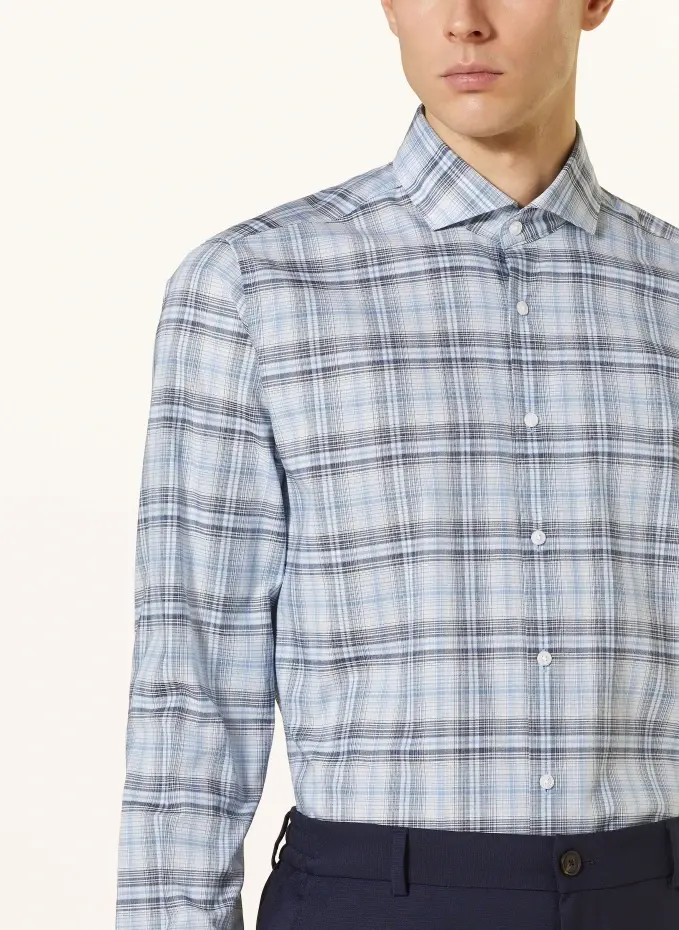 Посадка согласно производителю: Slim Fit. Ошейник «акула» со съемными стойками. Широкая кокетка сзади. Гладкая планка с пуговицами. Регулируемая по ширине манжета на одной пуговице. Проверьте рисунок повсюду. Чистый хлопок