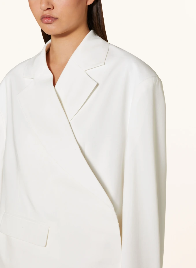 Прямого покроя. Воротник с лацканами. Наплечники. Двубортная застежка на потайные пуговицы. Карман с клапаном на окантовке спереди. Декоративные пуговицы по краям рукавов. Гладкая внутренняя подкладка. Эластичное качество