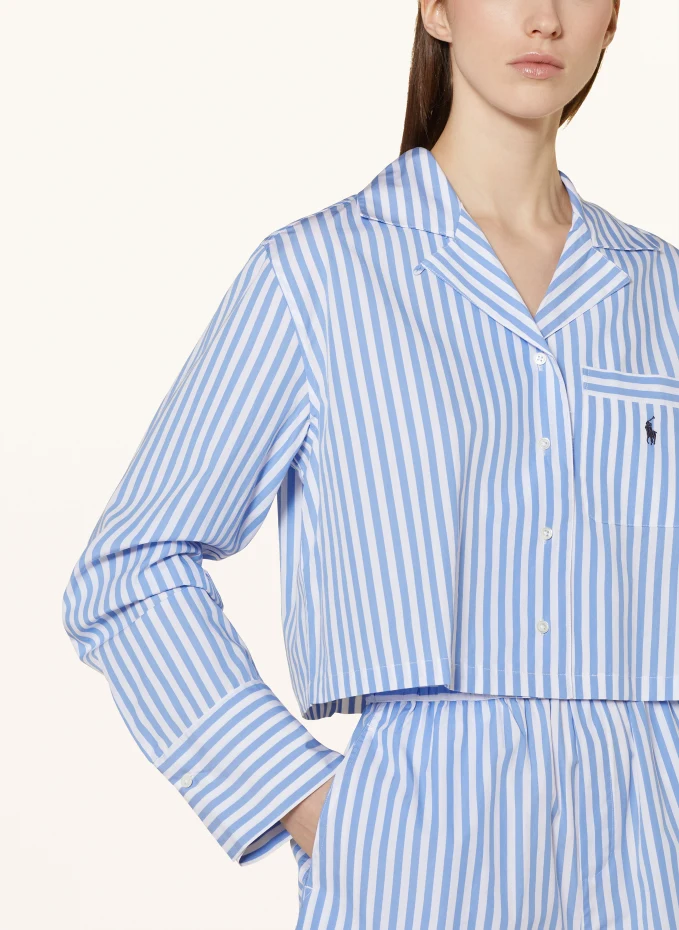 Рубашка: прямая, короткого покроя. Воротник с лацканами. Длинный рукав. Закрывается на планку с пуговицами во всю длину. Накладной нагрудный карман с пришивной этикеткой. Манжета на одну пуговицу. Полосатый узор. Дышащий. Тканый. Шорты: эластичный пояс. Прямая, короткая ножка. Полосатый узор. Дышащий. Тканый