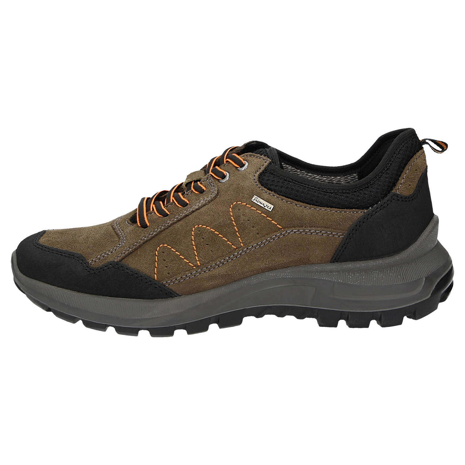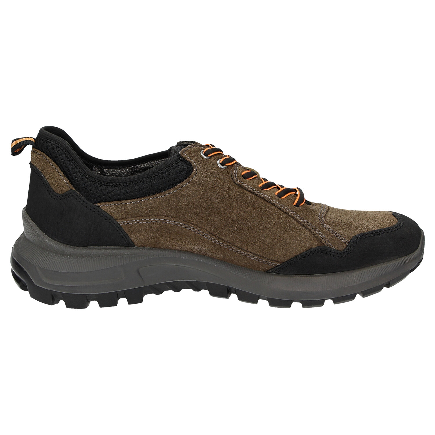 Мужские полуботинки на шнуровке для активного отдыха, изготовленные из комбинации телячьей замши и текстильных материалов. Мембрана Tex гарантирует, что вода не проникнет в верхний материал. Внутри обувь оснащена спортивной сетчатой подкладкой и мягкой кожаной стелькой. Он съемный и подходит для замены собственной вставкой. Легкая подошва из комбинации полиуретана с грубым профилем обеспечивает очень приятные ощущения при ходьбе.