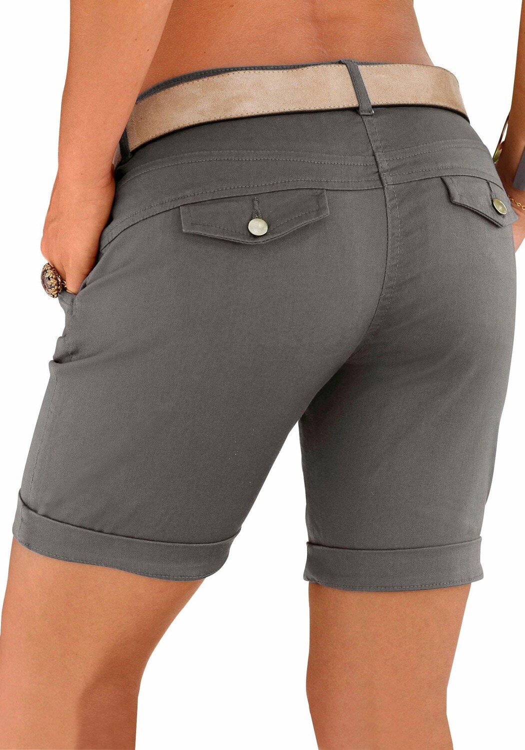 Шорты-бермуды от Lascana. Также идеально подходит для сворачивания. Плиссированная модель с боковыми карманами и декоративными клапанами сзади. Длина внутренней ножки около 20 см. Изготовлен из 98 % хлопка (поддерживается Cotton made in Africa), 2 % эластана.