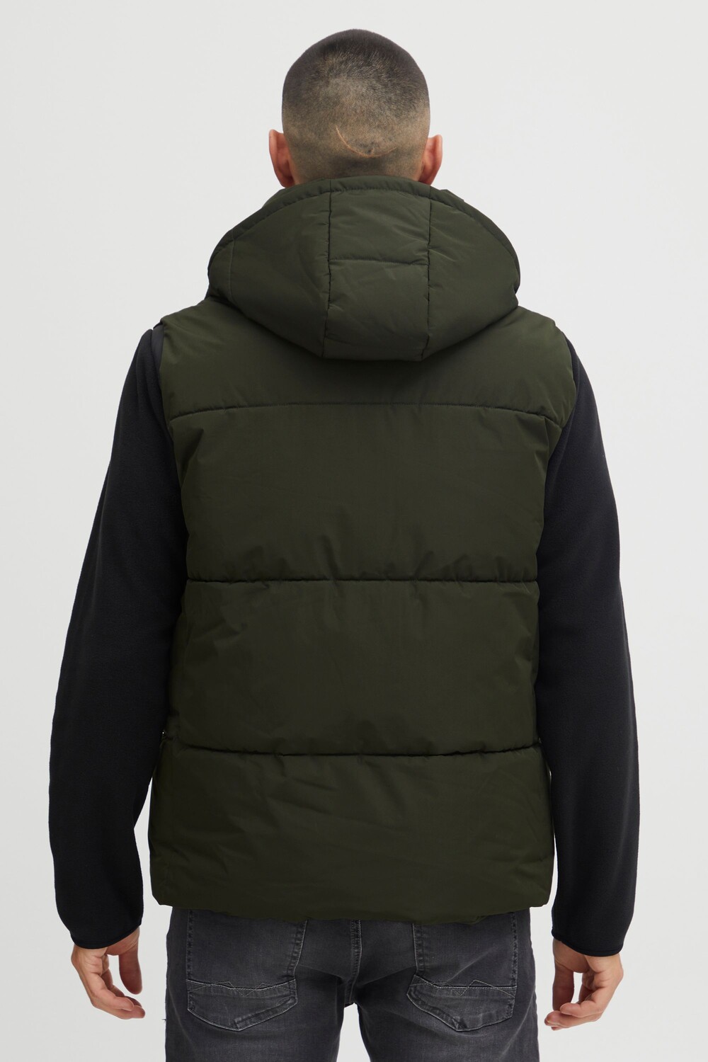 ДЕТАЛИ И ОСОБЕННОСТИ: Стеганый жилет, теплая подкладка, высокий воротник, капюшон на кулиске, резиновые завязки, застежка на молнию и планку на кнопках, резиновая нашивка, прямой низ, два боковых кармана и один нагрудный карман, один внутренний карман, водоотталкивающий материал. , стандартный крой, нагрудный карман из материала контрастного цвета.