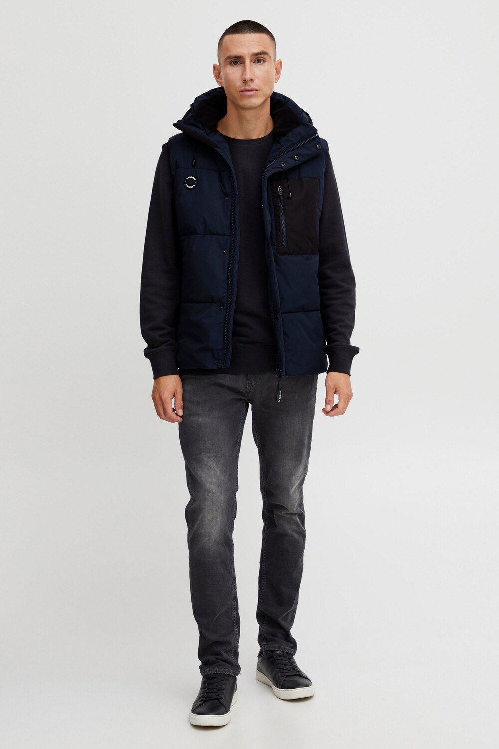 ДЕТАЛИ И ОСОБЕННОСТИ: Стеганый жилет, теплая подкладка, высокий воротник, капюшон на кулиске, резиновые завязки, застежка на молнию и планку на кнопках, резиновая нашивка, прямой низ, два боковых кармана и один нагрудный карман, один внутренний карман, водоотталкивающий материал. , стандартный крой, нагрудный карман из материала контрастного цвета.