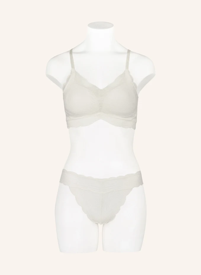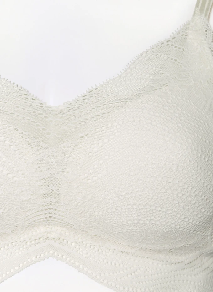 Мягкие чашки. Не железный. Без боковых стержней. Широкий мост. Регулируемые бретели-спагетти. Регулируется в четыре этапа сзади с помощью двух петель. Непрозрачная обработка. Бесшовная обработка. Кружевная отделка