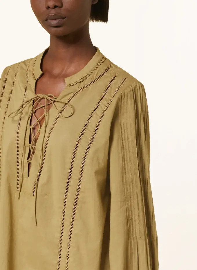 Прямого покроя. Вырез туники с завязками. Манжета на одну пуговицу. Тонкие боковые разрезы. Закругленный край. Декоративная английская вышивка. Декоративные защипы и бордюры. Чистый хлопок