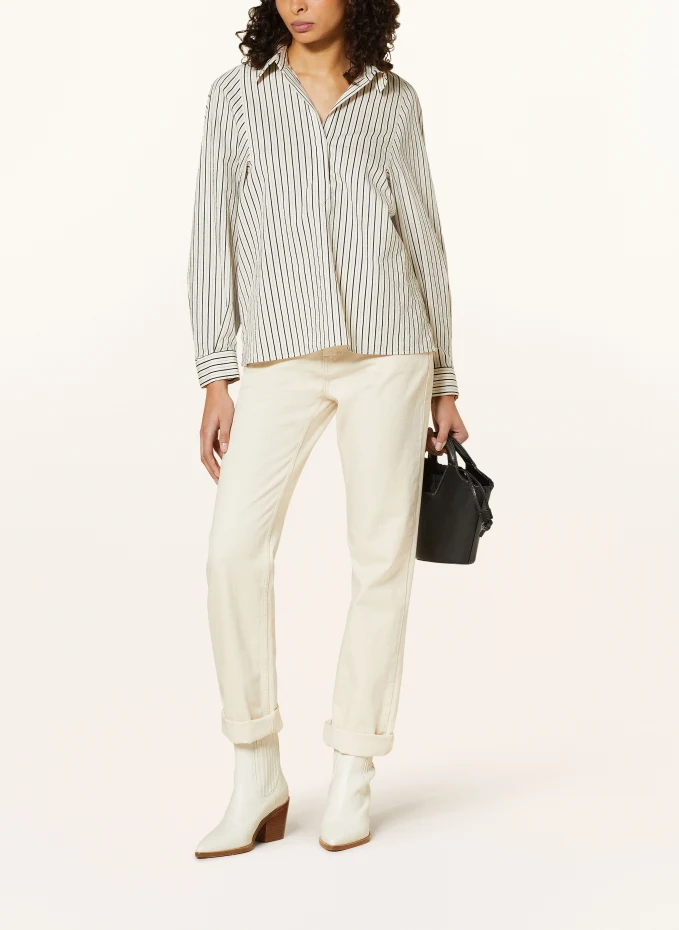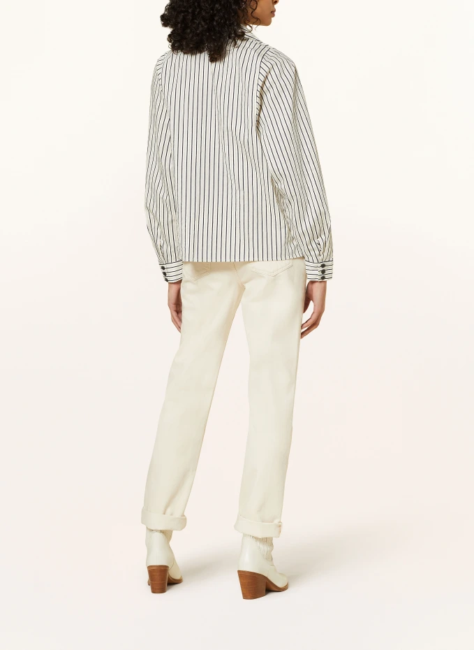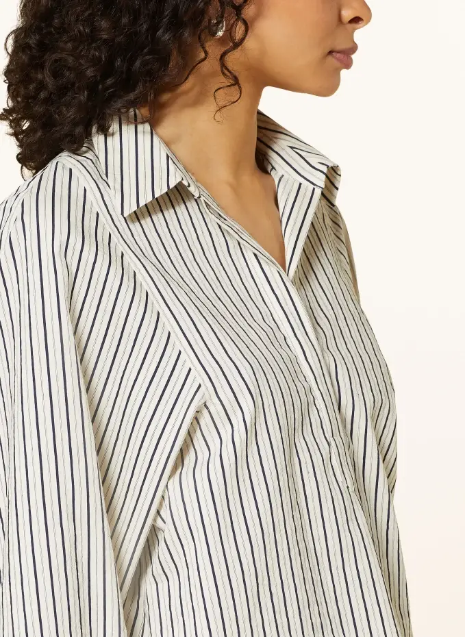 Прямого покроя. Отложной воротник. Закрывается на короткую планку с потайными пуговицами. Манжета на трёх пуговицах. Полосатый узор по всей поверхности. Качество крепа. Изготовлен из хлопка
