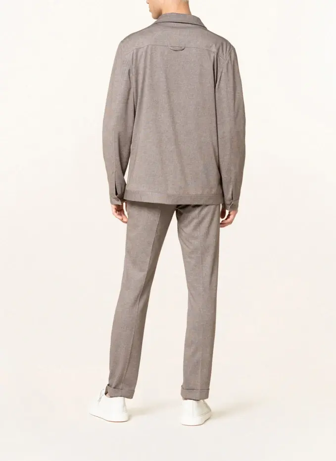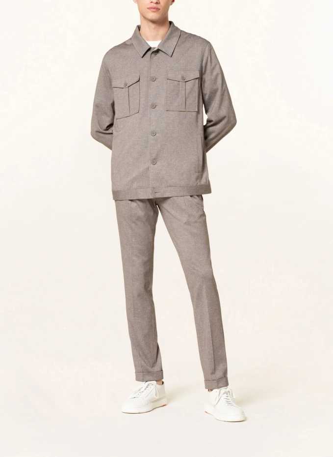 Прямого покроя. Отложной воротник. Широкая кокетка сзади с петлей. Закрывается на планку с пуговицами. Нагрудные карманы. Боковые прорезные карманы. Манжеты на одной пуговице на концах рукавов. Без внутренней подкладки