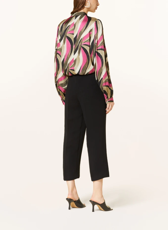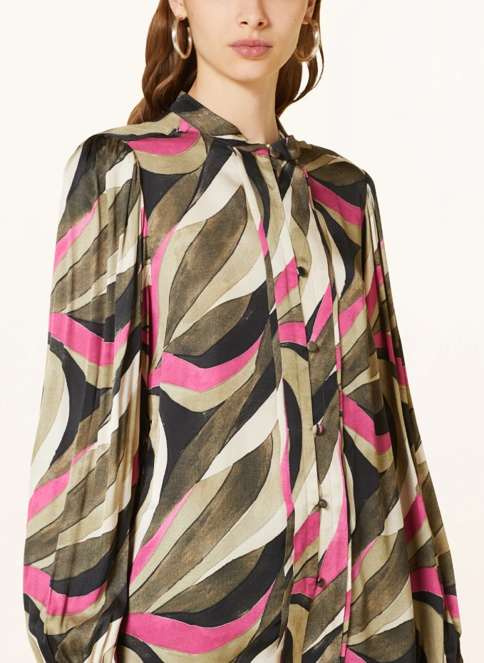 Прямого покроя. Воротник-стойка. Застегивается на непрерывную планку с пуговицами. С закрытыми пуговицами и люверсами. Манжета на одну пуговицу. Разделительный шов посередине спинки. Повсюду абстрактный узор. Гладкое, плавное качество