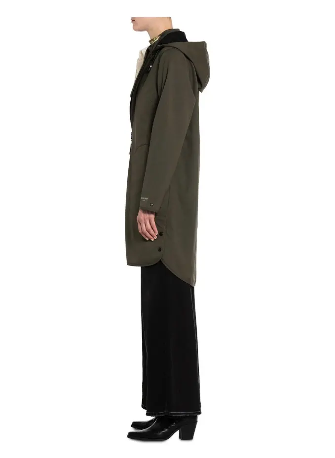 Прямого покроя. PFC бесплатно. Водо- и грязеотталкивающий. Высокий воротник с защитой подбородка. Съемный капюшон, регулируемый резинкой. Застегивается на двустороннюю молнию (водонепроницаемую). Боковые карманы на молнии. Регулируемый по ширине рукав заканчивается кнопками. Обработка на подкладке. Согревающая флисовая подкладка.