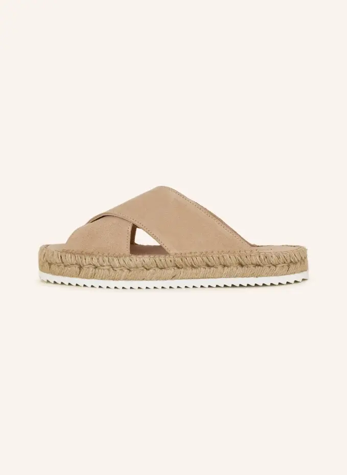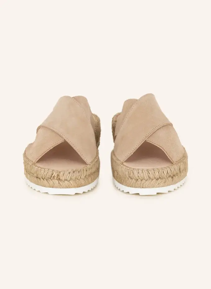 Замша. Широкие перекрещенные бретели. Печать этикетки на стельке. Подошва с рафией. Пилообразный вид. Сделано в Испании