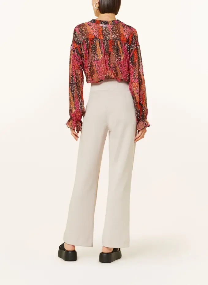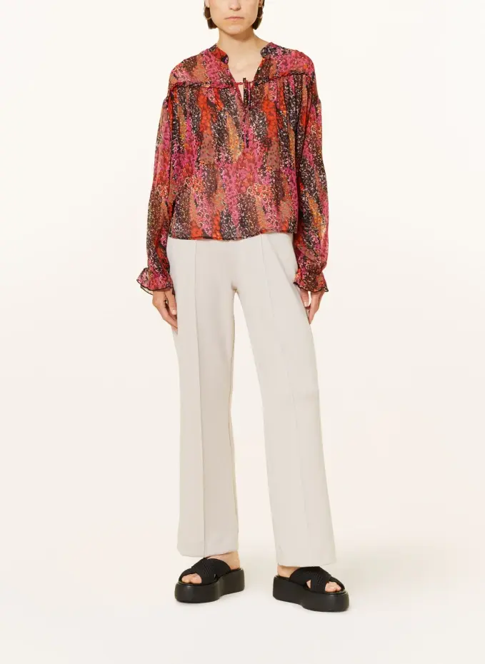Прямого покроя. Воротник-стойка. Вырез «капля» с завязывающимся ремешком. Эластичные кончики рукавов. Цветочный принт по всей поверхности. Полупрозрачная оптика. Ощущение плавности. Качество крепа
