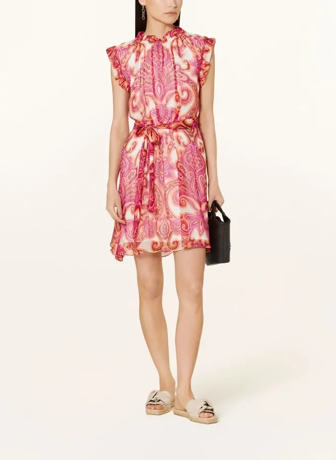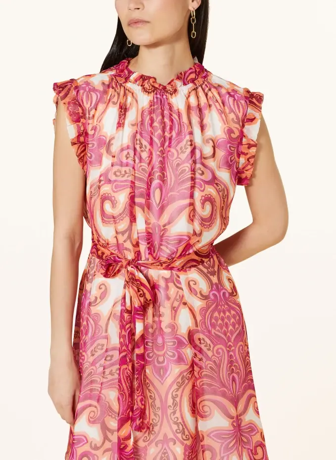 Прямого покроя. Эластичный воротник с рюшами. Без рукавов. Со съемным поясом и петлями для ремня. Обработка на подкладке. Отделка рюшами на проймах. Сплошной узор. Качество крепа