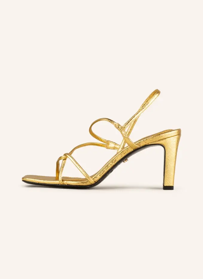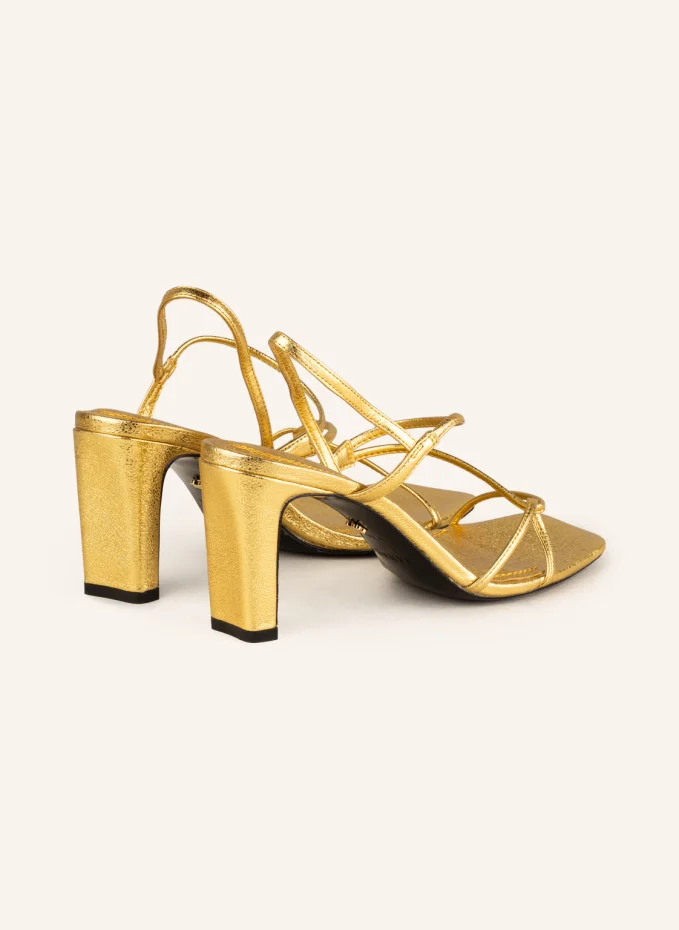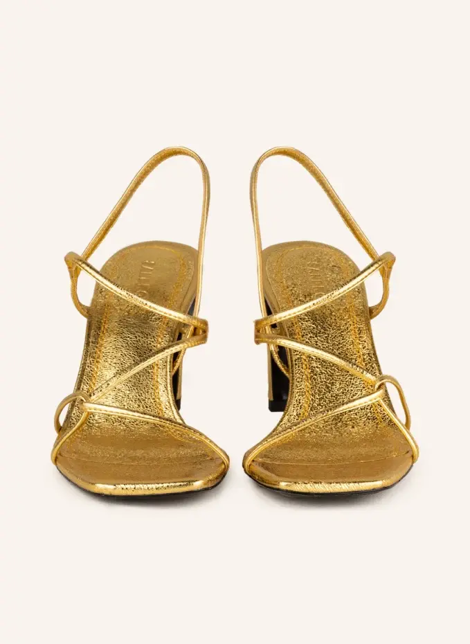 Текстурированная кожа. Кожа с металлическим эффектом. Перекрещенные лямки. Ремешок на щиколотке. Открытый носок округлой квадратной формы. Обтянутый блочный каблук. Кожаная подошва. Блестящая оптика