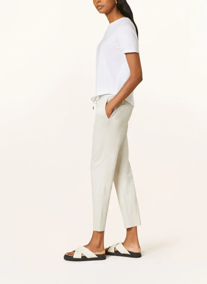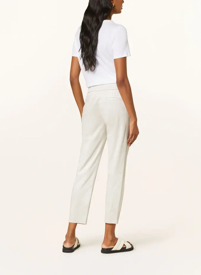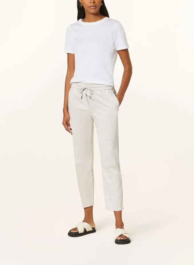 Высокая талия. Зауженная, укороченная ножка. Эластичный пояс со шнурком. Боковые карманы. Сзади декоративные прорезные карманы. Стиль бега. Замшевый вид