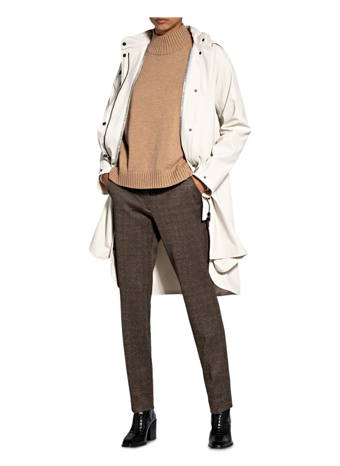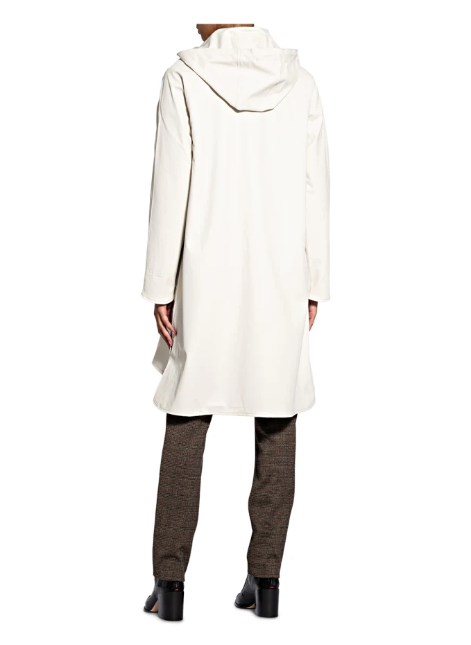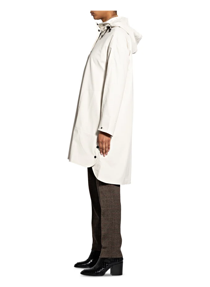 Нежная А-силуэта. Водонепроницаемость до 5000 мм. Проклеенные швы. Съемный капюшон. Высокий воротник. Шнурок и планка. Застегивается на молнию и планку с потайными пуговицами. Боковые карманы с клапаном от дождя. Расширенная задняя часть