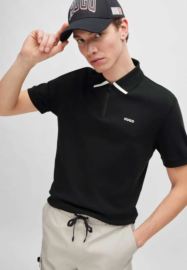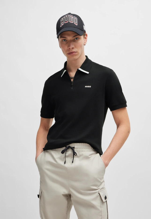 Спортивная рубашка-поло HUGO из хлопкового пике прямого кроя с планкой на молнии и контрастным логотипом. Регулярная посадка. Плоский вязаный воротник. Застежка сверху: молния. Короткие рукава. Ребристые манжеты.
