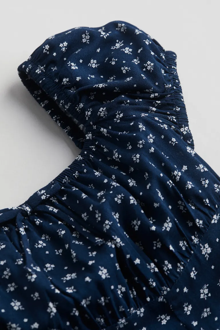 Креповое платье длиной до икры ампирного кроя с квадратным вырезом и короткими рукавами-фонариками кроя реглан. Платье украшено декоративным бантом спереди, присборенным лифом, создающим эффект драпировки, и закрытой резинкой на вырезе, манжетах и подоле. Прямой низ с разрезом для ног. Без подкладки. Длина: миди. Длина рукава: короткий рукав. Посадка: обычная посадка. Стиль: драпированный, с разрезом. Вырез: Квадратный вырез. Фасон рукава: рукава-фонарики, рукава реглан. Описание: Темно-синий/белый, цветочный.