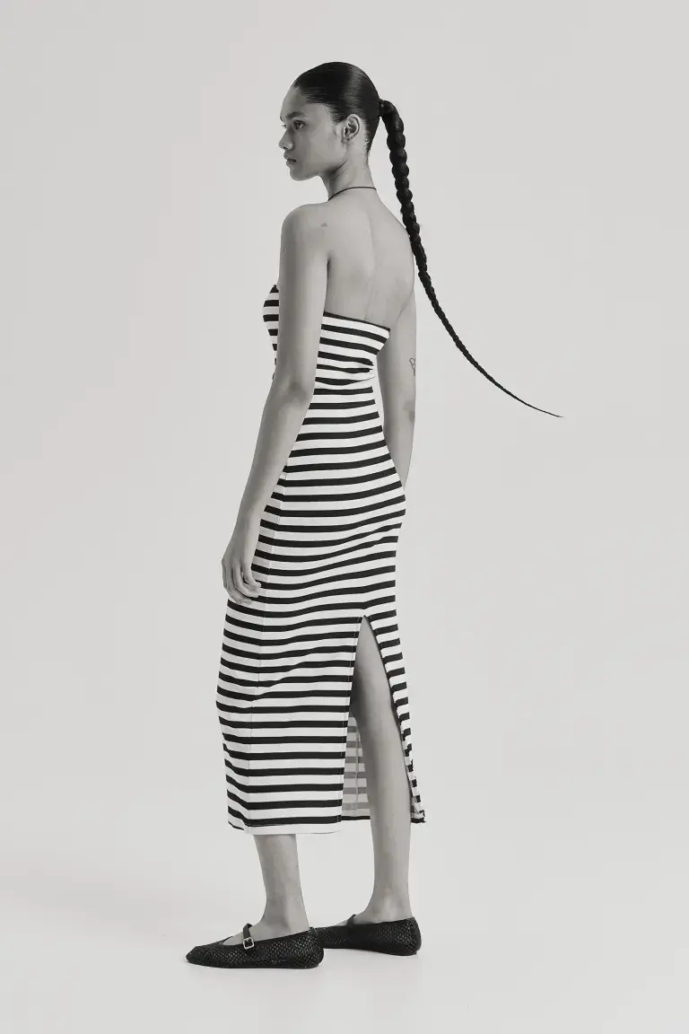 Облегающее платье-бандо длиной до икры из хлопкового трикотажа в рубчик со потайной силиконовой отделкой сверху для надежной посадки. Прямой низ с разрезом. Подкладка в области груди. Размер модели: Рост модели 177 см/5 футов 10 дюймов, на ней размер S. Размер: Сзади: Длина: 108,0 см (размер M), спереди: Длина: 114,0 см (размер M). Длина: миди. Длина рукава: Без рукавов. Модель: облегающая. Стиль: бандо, облегающий, с разрезом. Описание: белый/черный.