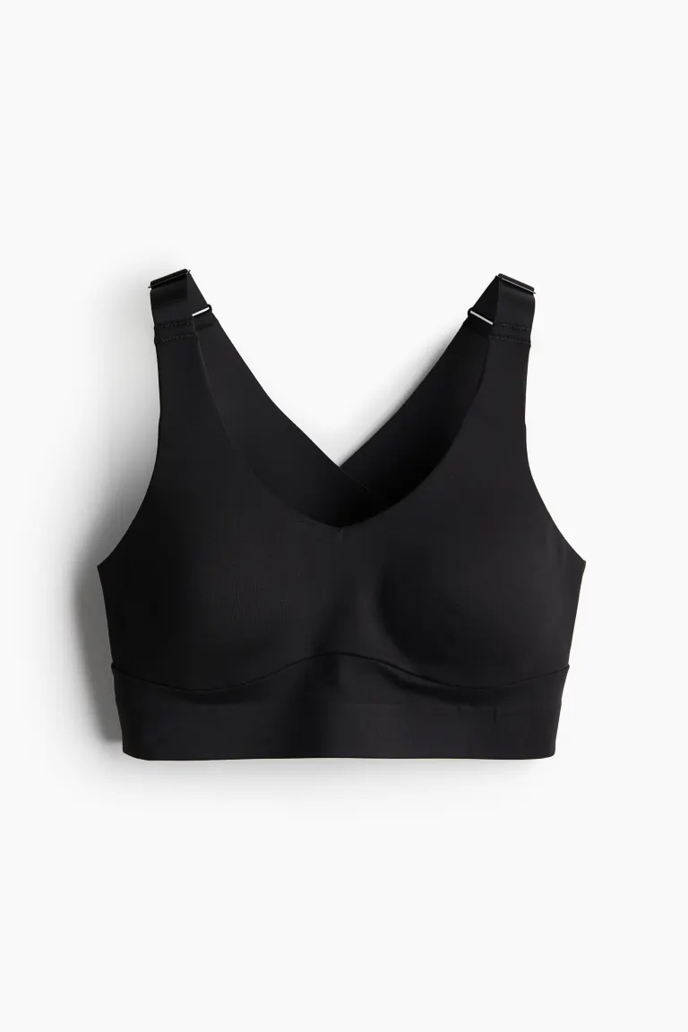 Спортивный бюстгальтер из функциональной ткани DryMove, которая отводит влагу от кожи, обеспечивая сухость и комфорт во время движения. Склеены для дополнительного комфорта. Чашечки предварительной формы с легкой набивкой. Широкие регулируемые бретели и застежка на крючок сзади. Максимальная поддержка высокоинтенсивных тренировок. Рост модели: рост модели 178 см/5 футов 10 дюймов, размер 75B. Стиль: бюстгальтер без бретелей, мягкий бюстгальтер, спина-борцовка, спортивный бюстгальтер. Особенности: впитывает влагу. Описание: черный, однотонный. Концепция: H&M Move