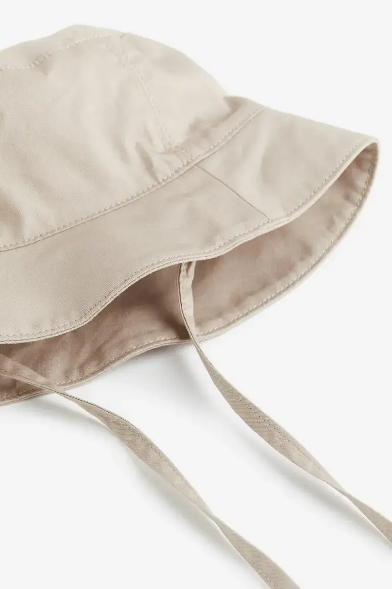 Панама из мягкого хлопка с ремешками на подбородке. Кормили. Стиль аксессуара: шляпа-ведро. Описание: Бежевый, Однотонный
