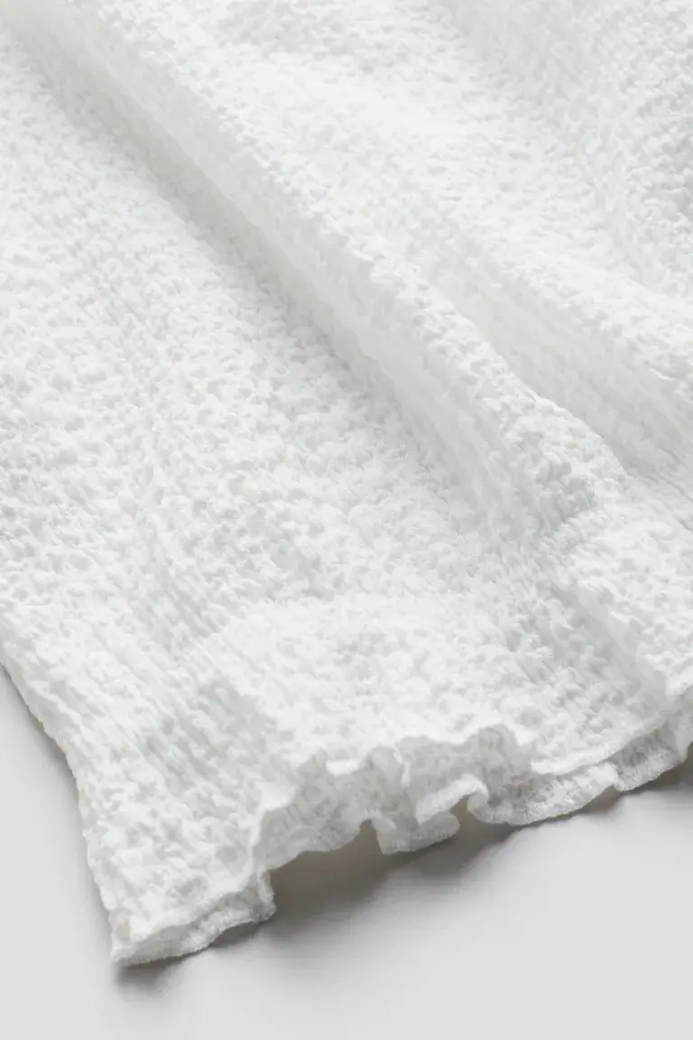 Рубашка из жатого трикотажа с широким вырезом и короткими рукавами-фонариками кроя реглан. Потайная резинка на вырезе и рукавах. Узкая резинка по низу и слегка расклешенная баска. Длина: Нормальная длина. Длина рукава: короткий рукав. Посадка: обычная посадка. Фасон: Расклешенный, баска. Вырез: вырез «балерина». Фасон рукава: рукава-фонарики, рукава реглан. Описание: Белый, Обычный