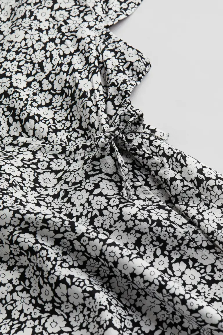 Платье с запахом и короткими рукавами из воздушной вискозы с V-образным вырезом. Завязки с одной стороны и потайная застежка с другой. Кокетка на талии и слегка расклешенная юбка. Без подкладки. Длина: Короткая. Длина рукава: короткий рукав. Посадка: обычная посадка. Стиль: расклешенный, с запахом. Вырез: V-образный. Описание: Черный/белый, цветочный.