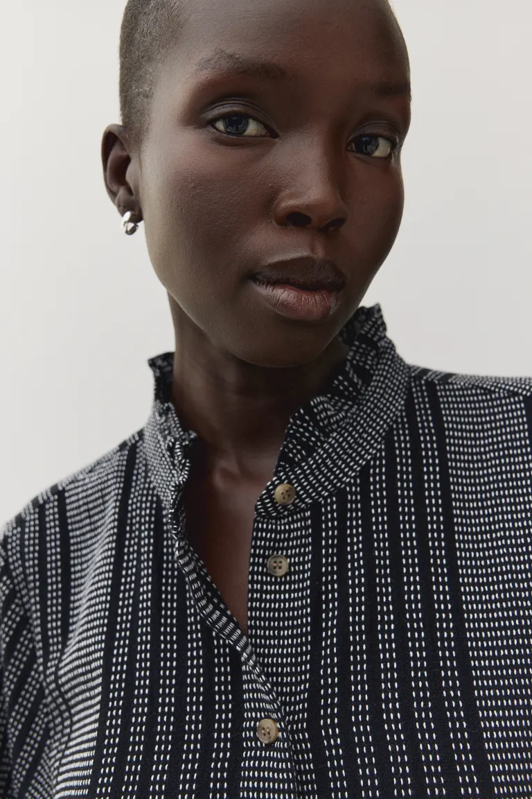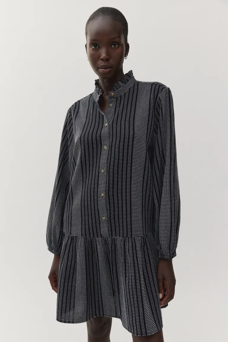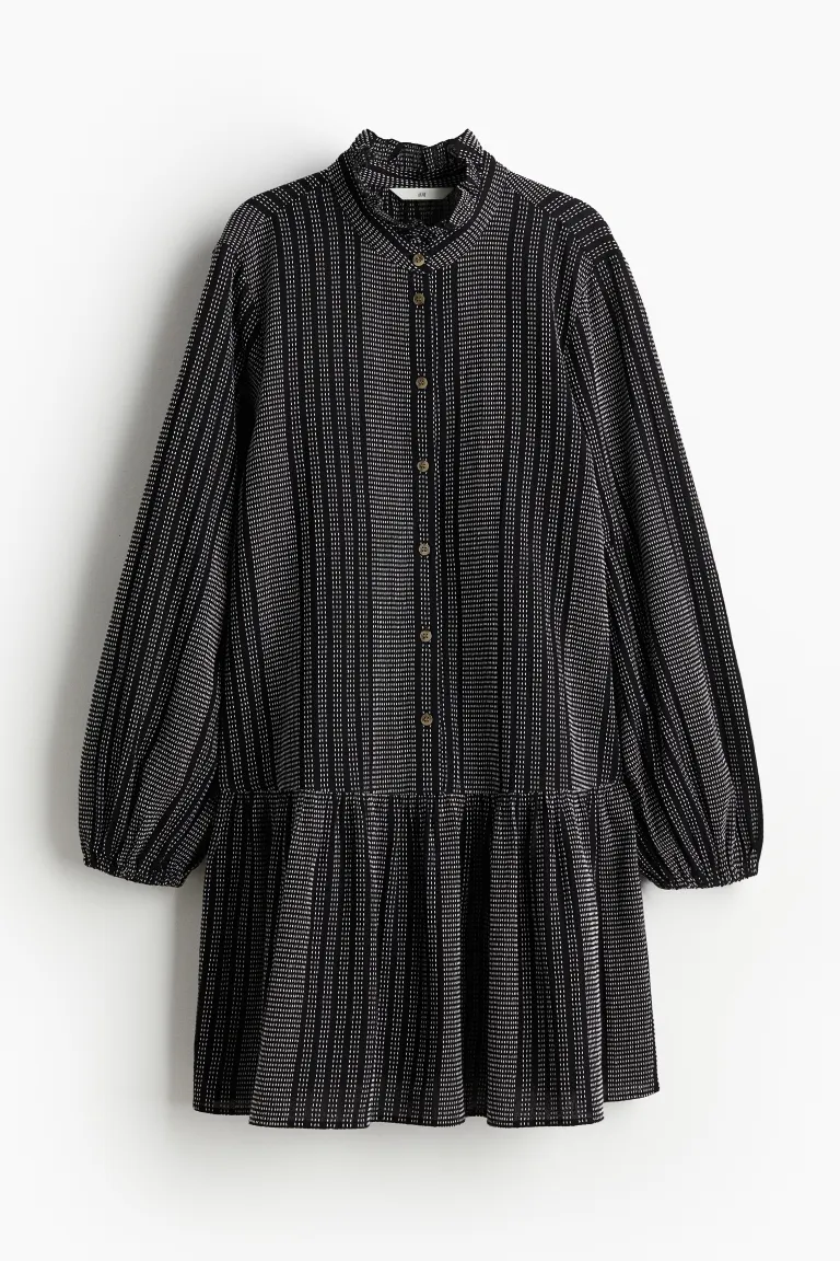 Короткое тканевое платье с воланным воротником и длинной планкой на пуговицах. Слегка завышенные плечи, длинные рукава-фонарики с эластичными манжетами и заниженная юбка. Свободная посадка. Размер модели: Рост модели 178 см/5 футов 10 дюймов, на ней размер M. Размер: Спина: Длина: 88,0 см (Размер M), Рукав: Длина: 60,0 см (Размер M), Плечо: Ширина: 44,0 см ( Размер М). Длина рукава: Длинный рукав. Воротник: Волан. Стиль рукава: Черный/Белый.