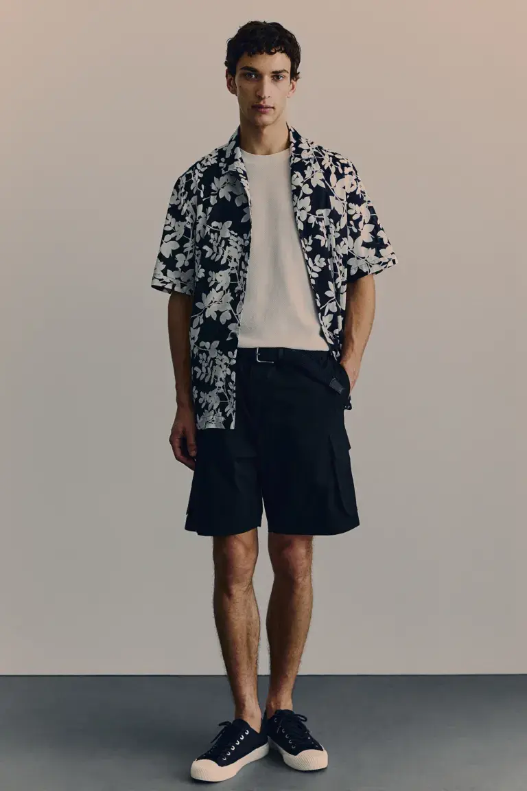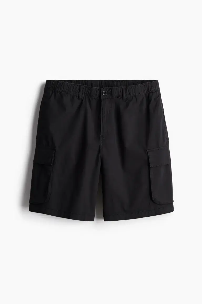 Шорты-Карго из мягкой хлопчатобумажной ткани с потайным поясом на кулиске, ширинкой на молнии и пуговице. Боковые карманы, прорезные карманы сзади и карманы на штанинах с клапанами и кнопками. Стандартная посадка для комфортного ношения и классический силуэт. Рост модели: рост модели 190 см/6 футов 3 дюйма, размер L. Длина: короткая. Пояс: стандартная талия. Посадка: стандартная посадка. Стиль: карго. Описание: черный, однотонный.