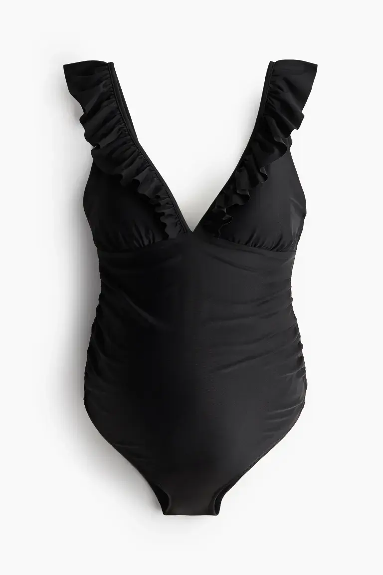 Купальник на сплошной подкладке с глубоким V-образным вырезом и оборчатой отделкой, переходящей на плечи. Чашки со съемными вставками, которые придают груди форму и обеспечивают хорошую поддержку. Сборки под грудью и по бокам для оптимального прилегания к животу. Среднее покрытие спины. Рост модели: Рост модели 178 см/5 футов 10 дюймов, размер M. Длина рукава: Без рукавов. Вырез: V-образный. Описание: Черный, Однотонный. Концепция: MAMA. Что нужно знать: Мягкая подкладка