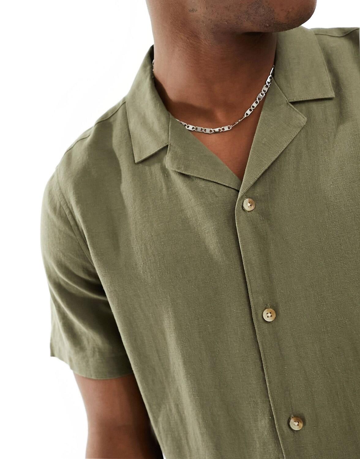 Рубашка с короткими рукавами из смесового льна темного цвета хаки.