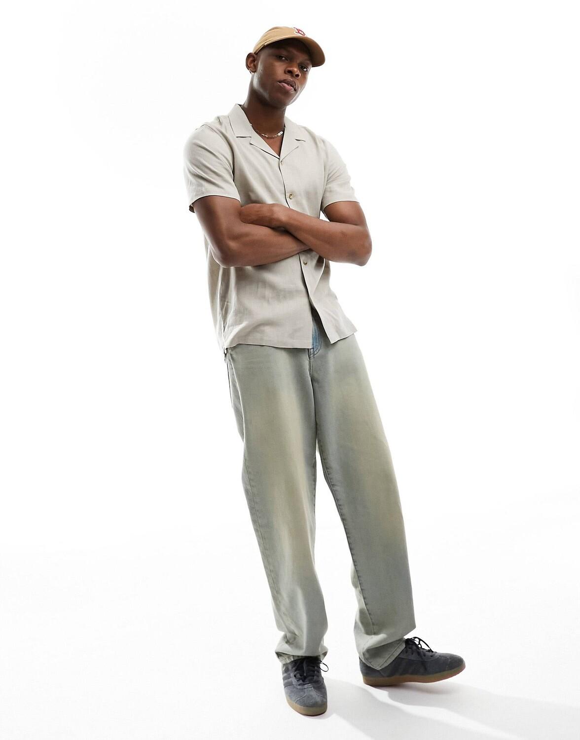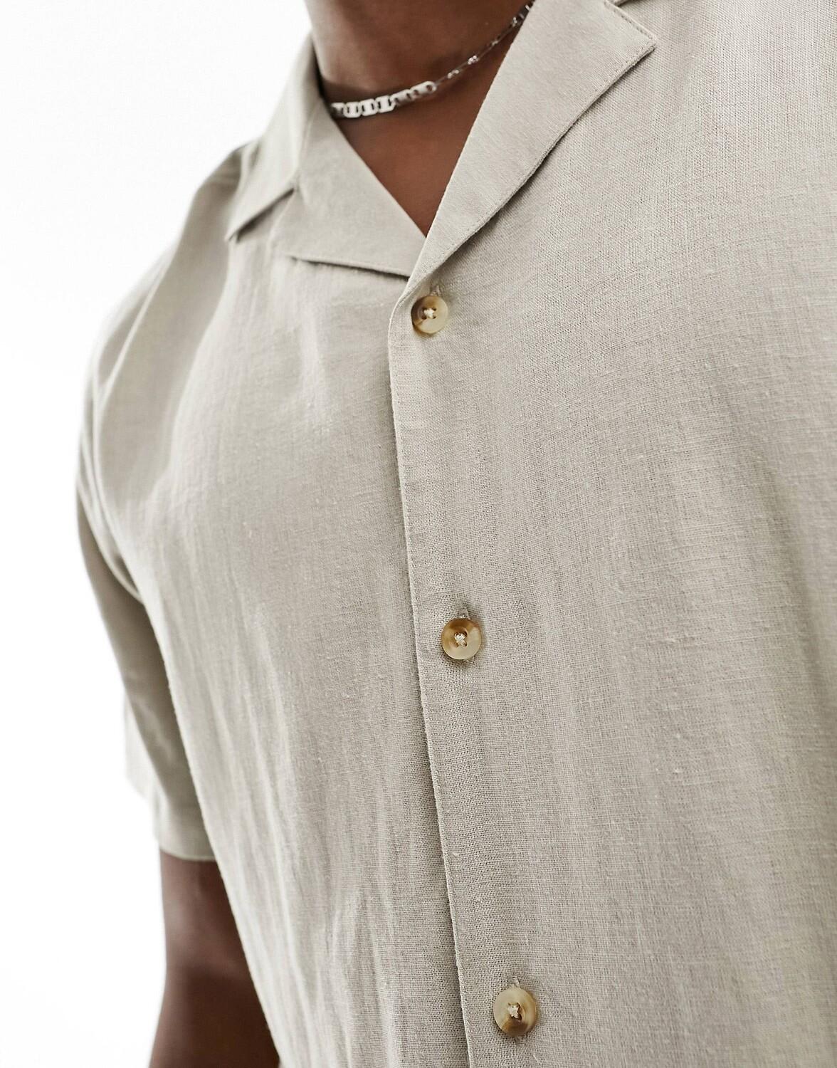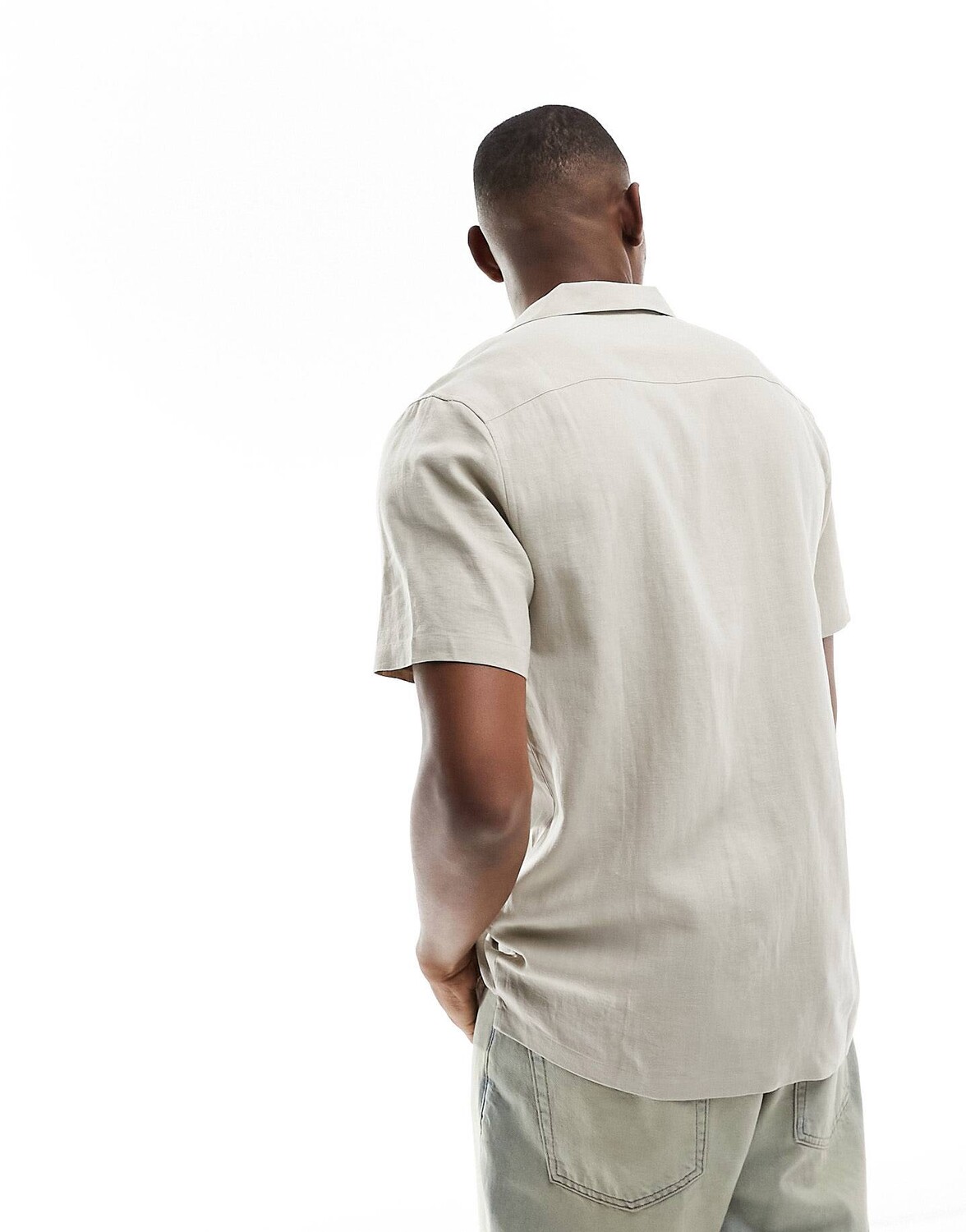 Рубашка с короткими рукавами из смесового льна темного цвета хаки.