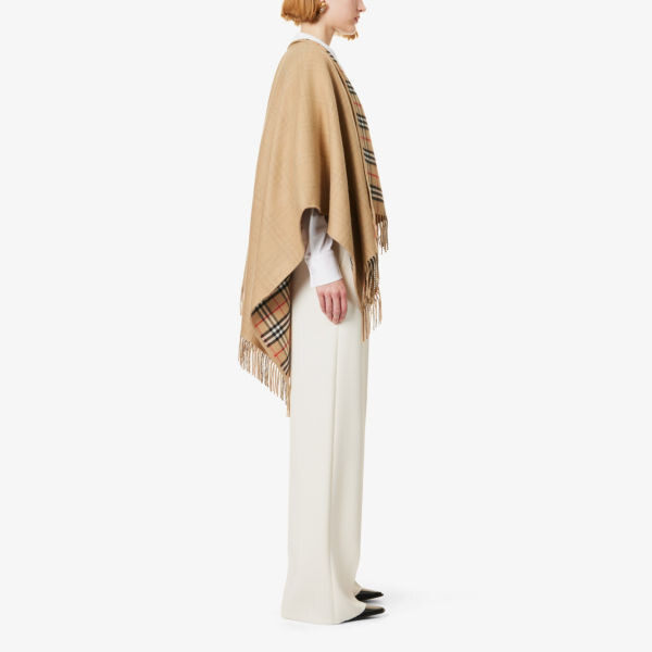 Шерстяная накидка Burberry. 100% шерсть. Надевается. Отделка бахромой, сатинированная текстура, фирменный узор в клетку внутри. Легкий, не растягивается. 130 х 130 см. Код продукта: 72658223.