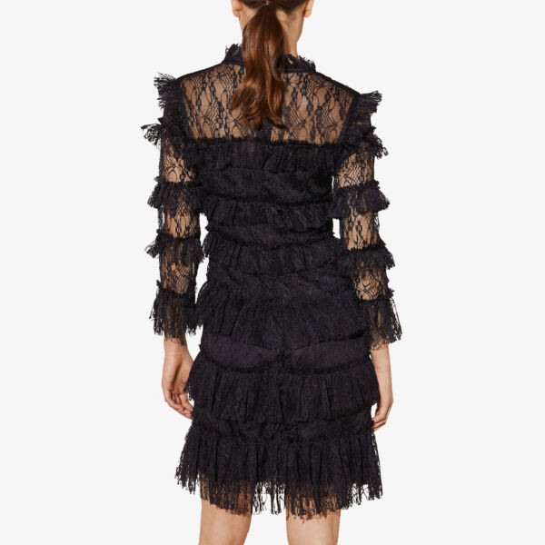 Тканое мини-платье Malina. 100% полиэстер; подкладка 97% полиэстер, 3% эластан. Открытая застежка-молния сзади. Высокий воротник, полупрозрачная кружевная кокетка и рукава, рюши по всей поверхности, многоярусная юбка, мини-подол. Машинная стирка холодной водой. Верный размер. Средняя плотность, небольшая растяжимость.
