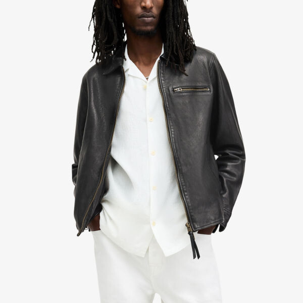 Кожаная куртка AllSaints. 100% кожа ягненка; подкладка 100% переработанный полиэстер. Открытая застежка-молния спереди. Классический крой, воротник, длинные рукава, один карман на молнии на груди, два прорезных кармана спереди, золотистая фурнитура, на подкладке. Специализированная чистка кожи. Модель 6 футов/1. Рост 83 метра, носит средний размер. Средней плотности, не тянется.