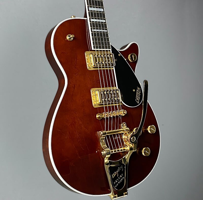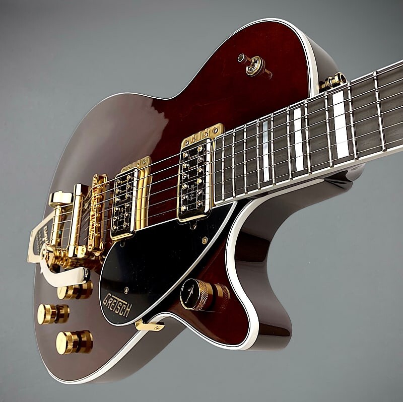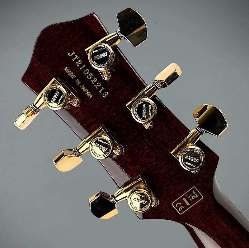 Дополнительные функции включают позолоченную фурнитуру, включая регулируемую matic, колки Gotoh с замком, классические ручки G-Arrow и струнодержатель Bigsby с вибрато — и жесткий футляр.