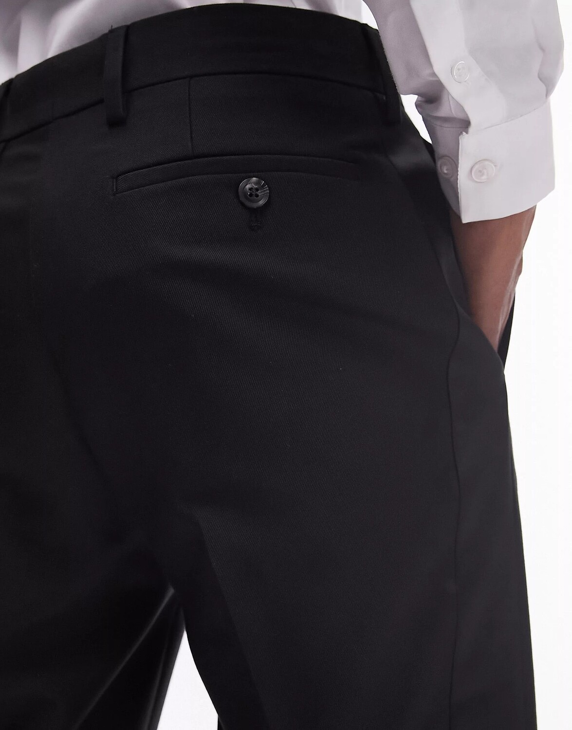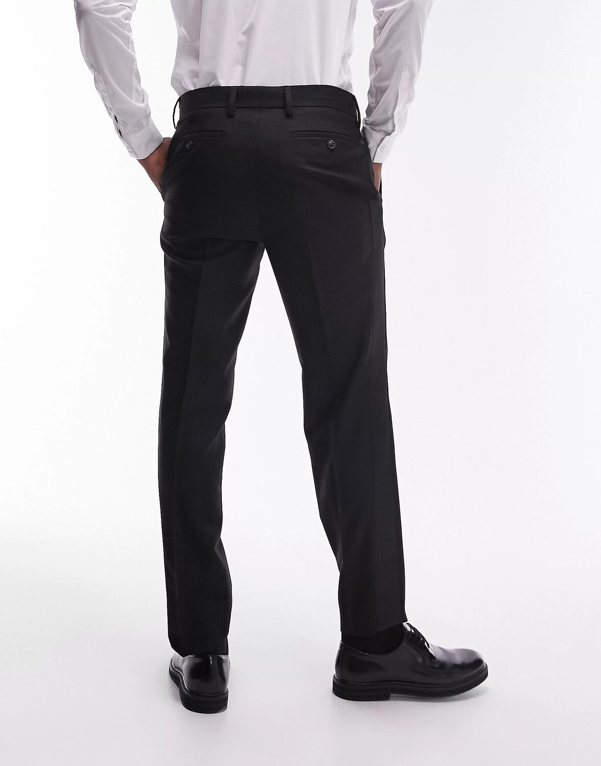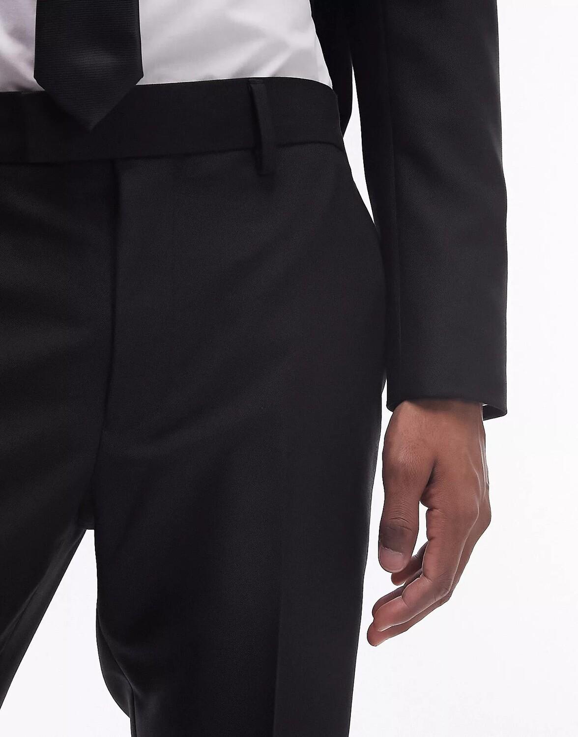 Облегающие брюки-смокинг выполнены из эластичной ткани с тканым переплетением.