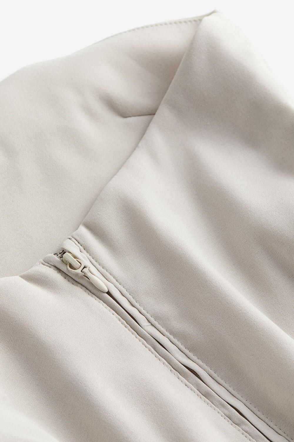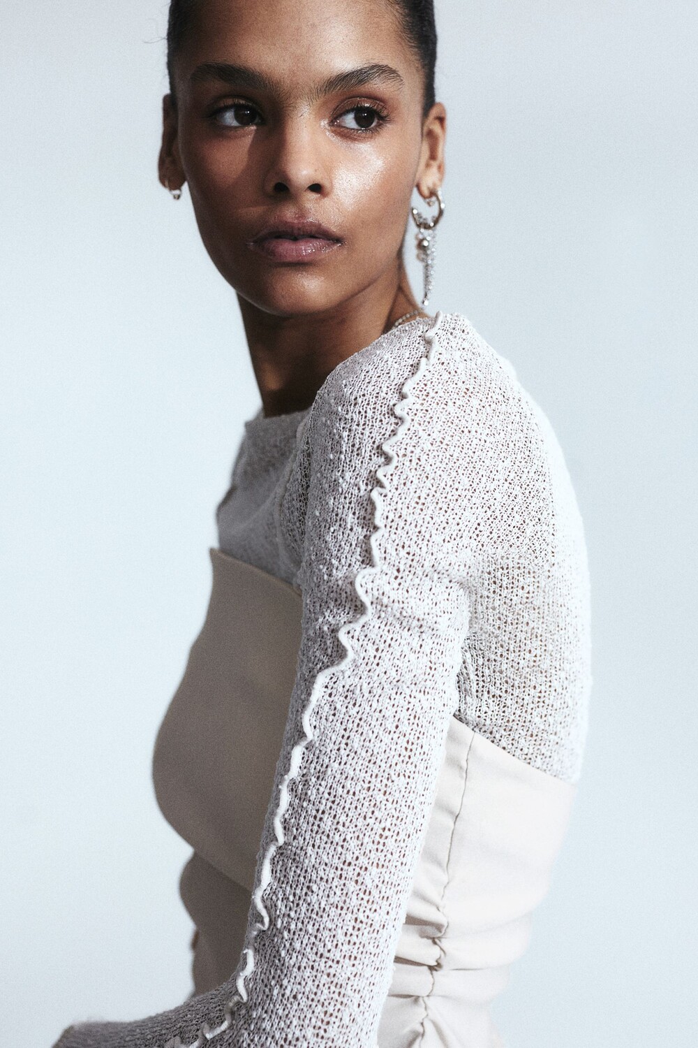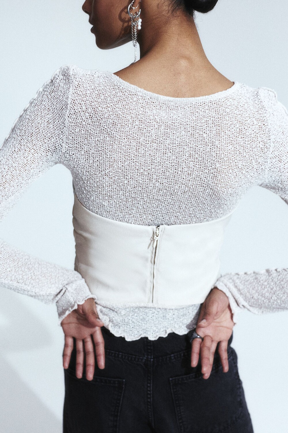 Укороченный топ-бандо. Присборенные швы по бокам создают эффект легкой драпировки. Потайная молния и застежка на крючок сзади. Без подкладки.