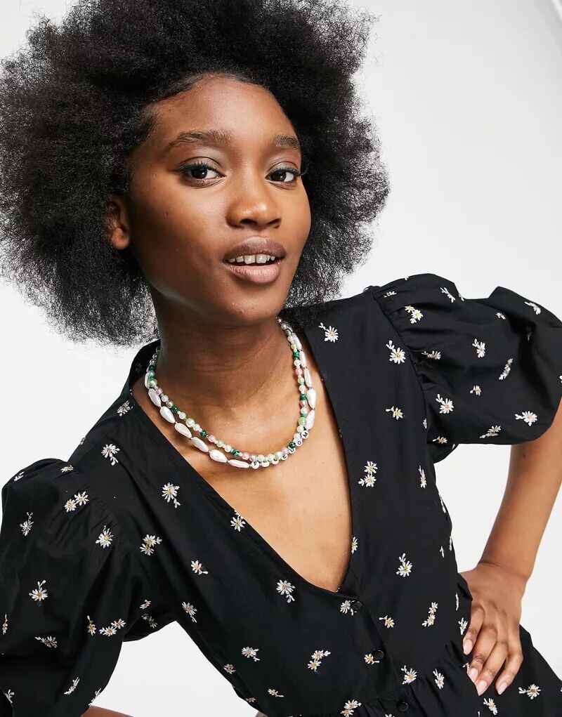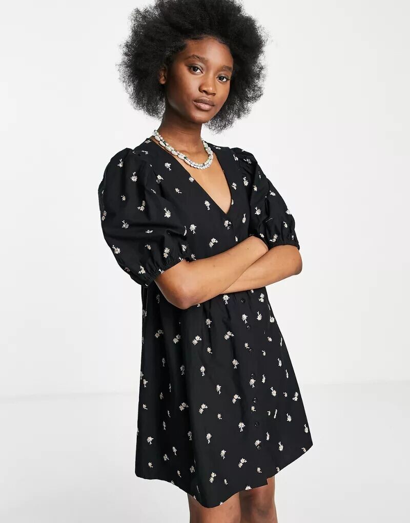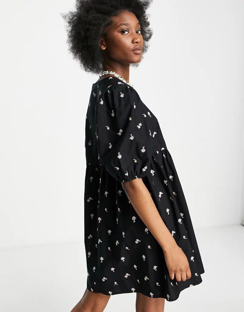 Черное свободное платье с вышивкой ромашками Miss Selfridge