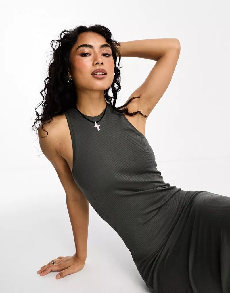 Темно-серое платье миди в рубчик со спиной-борцовкой Only
