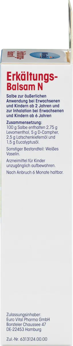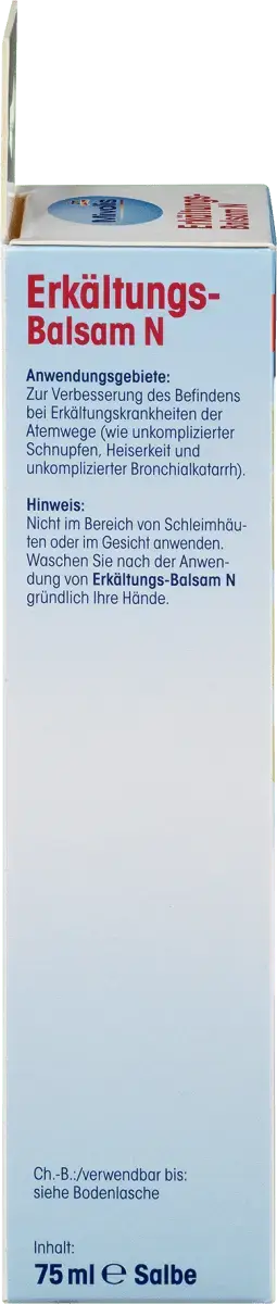 Активные ингредиенты : Левоментол, D-камфора, масло горной сосны и масло эвкалипта. Области применения: Для улучшения состояния при простудных заболеваниях дыхательных путей (таких как неосложненный насморк, охриплость голоса и неосложненный катар бронхов). Концентрация действующего вещества: 2,75 г левоментола, 5 г D-камфоры, 2,5 г масла горной сосны и 1,5 г эвкалиптового масла. Форма выпуска: Мазь для наружного применения взрослым и детям от 2 лет и для ингаляций взрослым и детям от 6 лет и старше Точное наименование: Бальзам от простуды Н